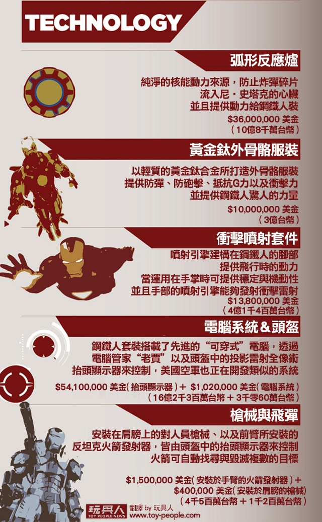 首先是鋼鐵人盔甲開始。「鋼鐵人」的動力來源,「弧形反應爐」是3600萬美金(約10億8千萬台幣)。超酷的「投影雷射全像術抬頭顯示器」頭盔,要價5410萬美金(約16億2千3百萬台幣,結果第一集就這樣給鐵芒果捏爛了...XD)。以及其它出色裝備滿載的鋼鐵人盔甲一件,合計金額是1億103萬2千美金(約台幣33億9百06萬),這樣的金額,即便是中樂透都買不起啊!!!