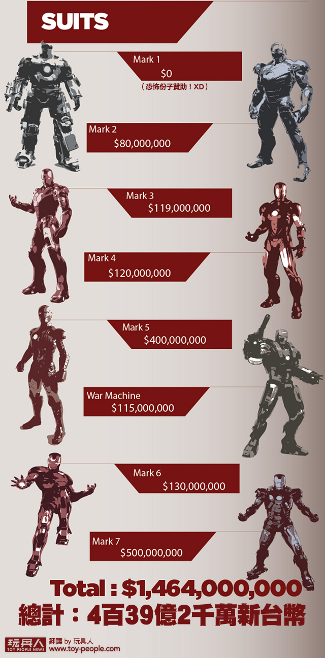 當然,「鋼鐵人」的盔甲絕對不只一件!加上歷代的盔甲、好媽吉羅德少校的「戰爭機器」...算一算合計14億6400萬美金(約4百39億2千萬)。不過話說回來,「馬克1」的費用是0元,對手工藝有自信的人也許可以挑戰看看?!(不過有可能要被恐怖份子俘擄才行。)