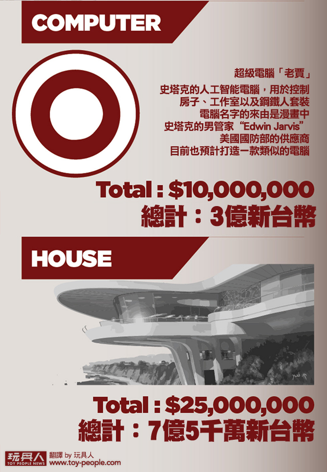 雖然不是必備品,想跟「東尼‧史塔克」一樣,那麼就要2500萬美元(約7億5千萬)的加州馬里布超級豪宅、還有搭配上豪宅的高級超跑約341萬5千美元(約1億零2百45萬)。除此之外,家電的管理、鋼鐵人盔甲的控制都需仰賴的超級電腦也不可欠缺~價格是1000萬美元(3億台幣)!恩...這樣算下來價格真的很實惠呢!(錯覺)。