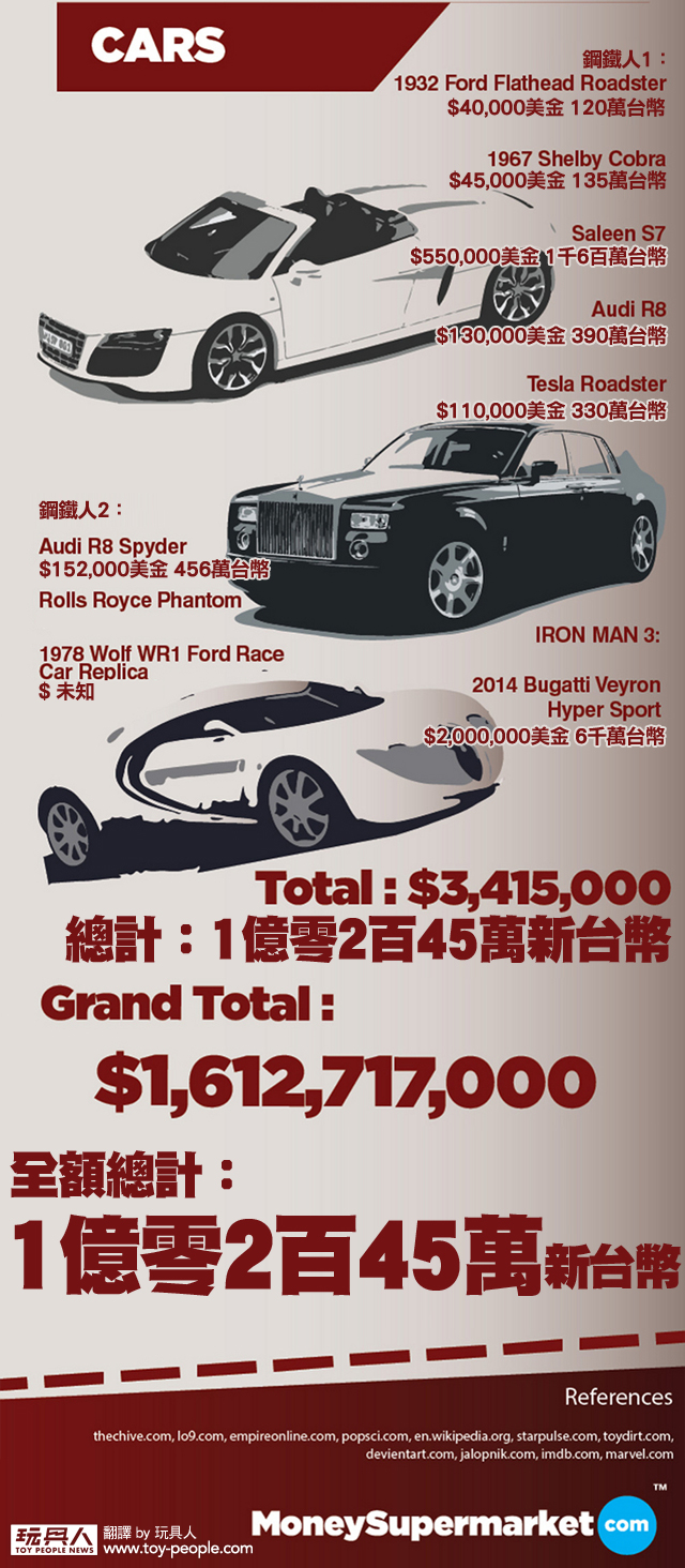 英國的一個比價網站Moneysupermarket.com 製作了一份關於鋼鐵人的簡單分析報告,小編特地翻譯成中文以及換算成新台幣,讓各位玩具人瞭解,想要在現實生活中成為「鋼鐵人」到底要花費多少錢?