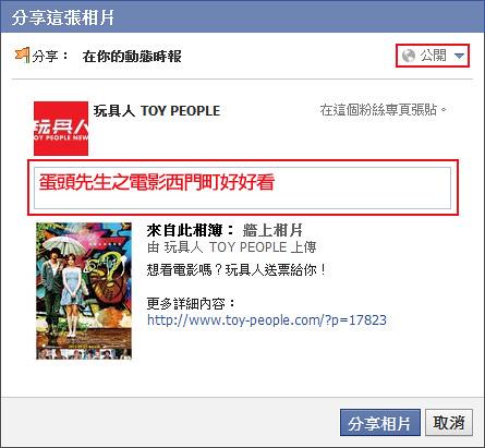 2.分享時記得右上角要設定為公開,並留下「蛋頭先生之電影西門町好好看」在你的塗鴉牆上喔。