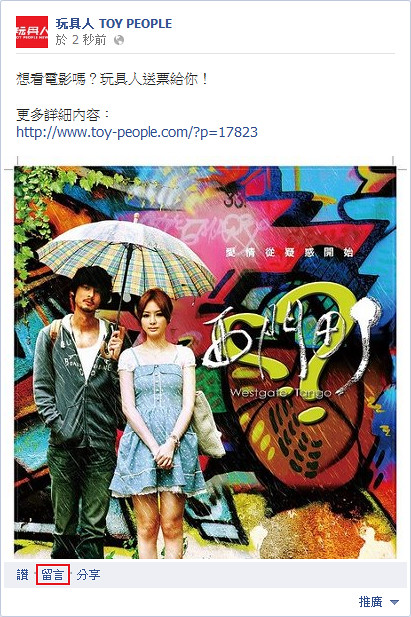 1.到「玩具人」本次的國片電影西門町-最佳男主角蛋頭先生歡喜來贈票文章按“讚”,並分享至你的塗鴉牆上。(分享必需並加上「蛋頭先生之電影西門町好好看」的文字!)