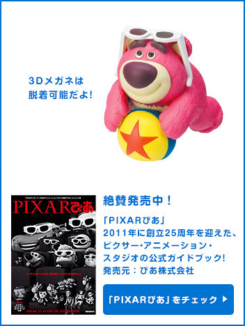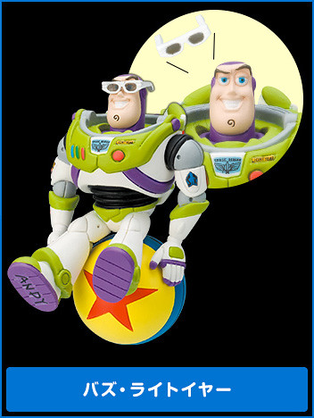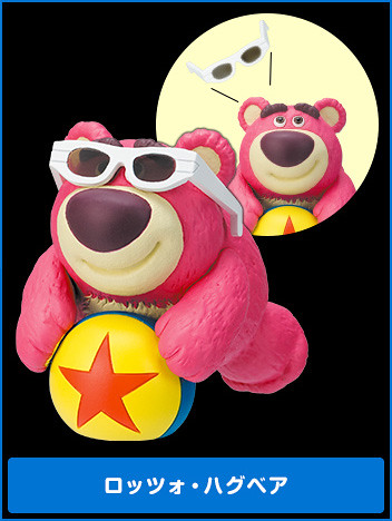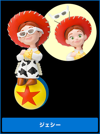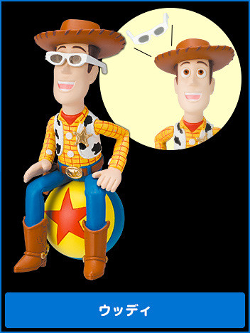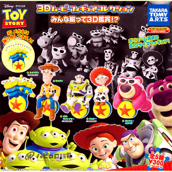 TAKARA TOMY ARTS 推出了大人氣的3D 動畫「玩具總動員」3D 電影轉蛋組,以皮克斯(PIXAR)25週年紀念刊物「PIXARぴあ」封面為發想,將玩具總動員中的經典角色,戴著3D眼鏡的模樣一一立體化!每個角色皆可將3D眼鏡取下,全套一共有五款角色:伍迪、巴斯光年、翠絲、三眼怪以及熊抱哥!