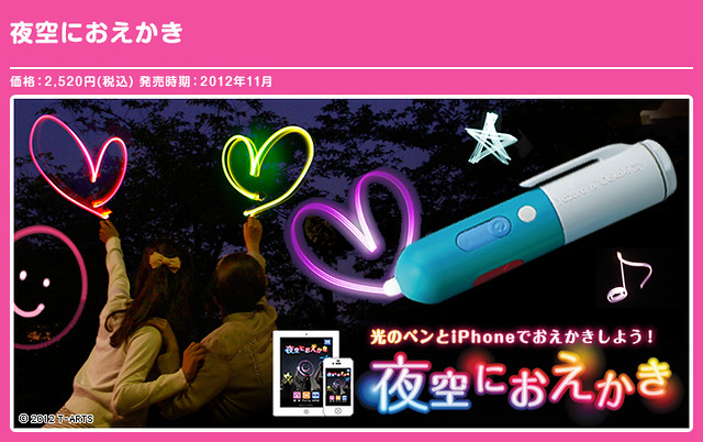 您是否也想嚐嚐像岸邊老師一樣凌空畫出天堂之門的快感?有了TAKARA TOMY推出的這款神奇光筆就不再是夢想囉~原本網路上就曾經有人示範過用攝影技術拍出凌空作畫的神奇效果,但所需步驟較為繁複。TAKARA TOMY採用了這個創意,但簡化成與iphone連動就能輕易達成的創意商品,現在想要凌空作畫人人都能簡單入手囉~同時本商品對應的APP也有簡易編輯與分享功能,也許將掀起一股流行風潮也不一定?本商品預計2012年11月推出,日幣參考售價約2520圓,提供大家參考!
