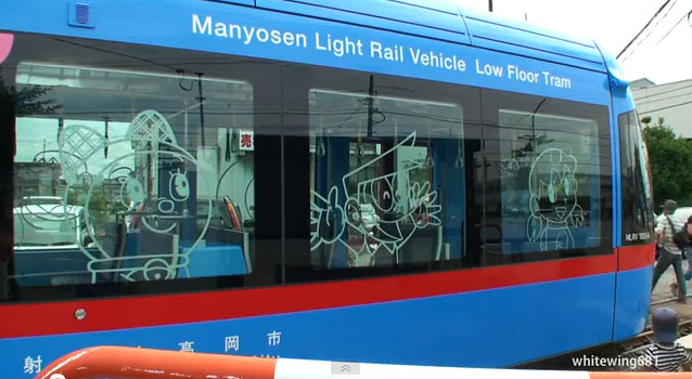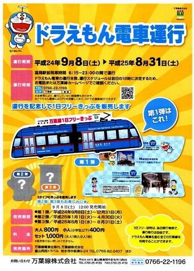 哆啦A夢出生前100週年的活動一直陸續曝光,日本高岡市製作了一輛万葉線(高岡~射水)でドラえもん電車 哆啦A夢主題電車,高岡市是哆啦A夢作者藤子‧F.不二雄的故鄉,高岡市特別推出這款紀念版哆啦A夢主題電車,營運時間從2012年9月8日到2013年8月31日。