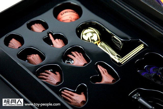 ▼ 第二層是配件。8 副不同款式的替換手部零件、NBA比賽專用球、NBA 總冠軍獎盃、客場款球鞋(黑)以及地台。