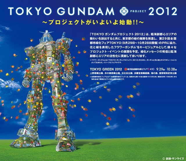 小編在今年3月時曾報導過2012年鋼彈大佛重返東京台場,最近繼續以宣傳都市綠化為主題,在台場的18公尺高的鋼彈旁附近又製作了花之鋼彈(フラワーガンダム)的腰部立像,展出時間預計在2012年9月29~10月28日,不過就最下方的海報看來不知道會不會如海報中的鋼彈一樣,製作出整個花之鋼彈的模樣!實在還蠻佩服日本真會做其相關的行銷活動,消息提供給有計畫前往日本旅遊的玩具人參考。