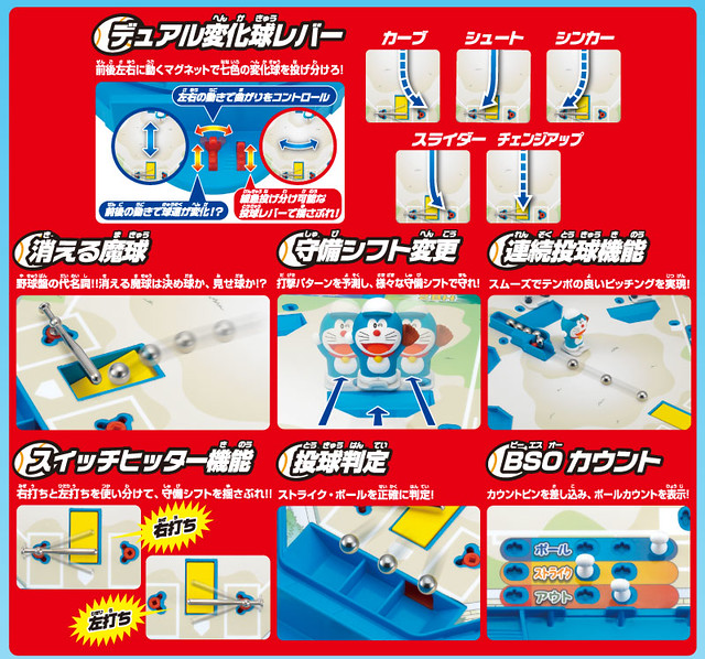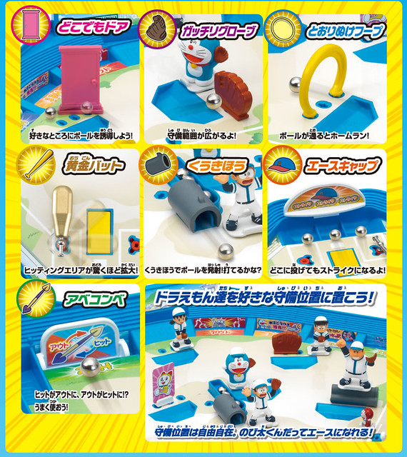 日本玩具公司EPOCH擅長製作野球盤(桌上型棒球彈珠台),這是一種以鋼珠打擊遊戲模擬棒球賽的桌上型遊樂器,EPOCH作了一系列這類型的商品,甚至得到日本玩具大賞喔!近日因為小叮噹誕生前100年話題正夯,所以趁熱推出小叮噹特別版。場地設計在漫畫中大家常去聚集玩樂的空地,全員到齊一起打棒球。但不只是打棒球這麼簡單,玩具商絞盡腦汁想要這個遊戲盤充滿小叮噹風格特色,所以任意門、空氣槍等著名道具一一登場,而且各自有增加遊戲變化性的作用,真是太用心了!本商品日幣參考售價約6279圓,預計2012年10月中推出,各位玩具人可千萬別錯過喔!