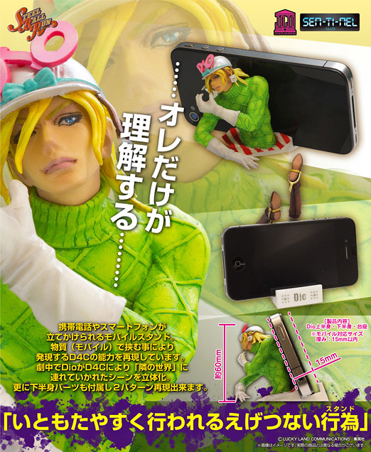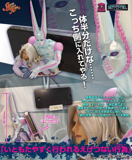 日本造型廠商千值練推出了「jojo冒險野郎」第七部:「飆馬野郎」(STEEL BALL RUN / スティール・ボール・ラン)迪奧、最終頭目大總統與其替身D4C立體造型手機座。