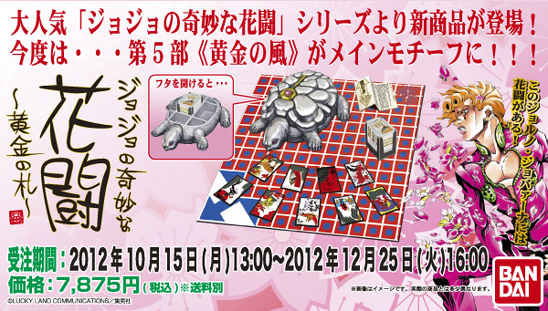 「花牌」又稱「花札(はなふだ)」、「花鬥」,是日本傳統紙牌遊戲的一種。最近日本大紅的JOJO冒險野郎竟也將腦筋動到這裡來,設計了一款花牌組合。採用第五部替身使者「烏龜」的造型設定作為收納盒,內含花牌一組。花牌包裝採用第5部圖像風格設定,非常漂亮,相信JOJO迷都會想要入手。至於花牌規則可以到以下網址研究:http://baike.baidu.com/view/563375.htm?fr=ala0_1_1。本商品採預約生產制,預計開放預約到12月25日。日幣參考售價約7875日圓,預計㈰ㄳ年3月前出貨,提供大家參考!