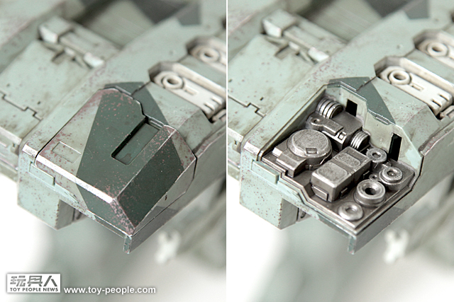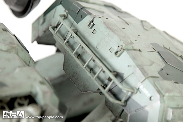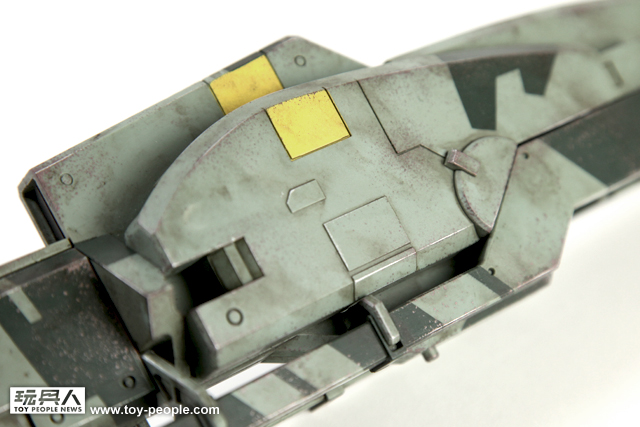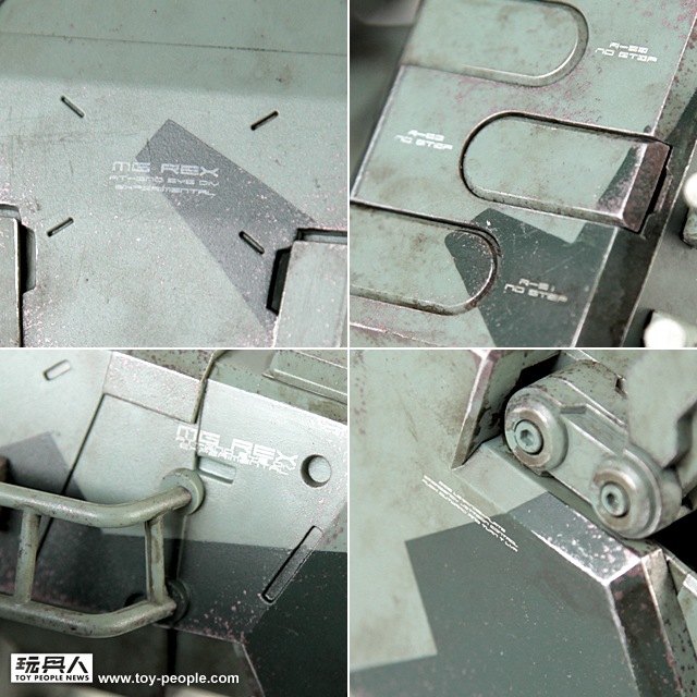 ▼ 除了用心製作的舊化塗裝,具體呈現了Metal Gear REX 經歷激烈戰鬥的模樣之外,機身上許多細微的標示文字也忠實呈現,這樣的用心讓REX 宛如真實存在的武裝載具。
