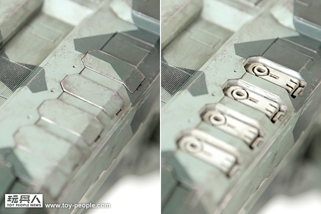 在開箱把玩的過程中很難見到一般模型的分模線,或其它令人覺得是「玩具」、「模型」的瑕疵,令人強烈地感受到threeA 對於細節的講究與造型的用心。此外,threeA 獨步全球的舊化塗裝效果更是為REX 注入了一份真實感,再一次的讓我們體現繼「鋼鐵擂臺」之後,另一款強烈的金屬重量感、歷經許多激烈戰鬥的硬派作品。小編在開箱攝影的過程中,一位不熟悉threeA 的同事問「天啊~這麼大用全金屬製作很重吧?你這樣會把攝影台壓壞喔...」