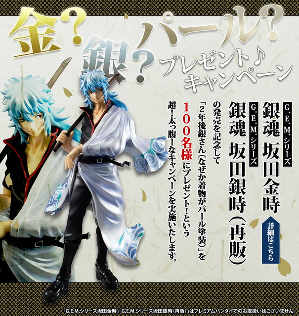 喜歡銀魂的朋友大概都是被作者超強的惡搞功力所吸引,其中超級惡搞人物坂田金時登場時,甚至連漫畫標題都改成金魂了,真不得不佩服作者還真有創意啊!這位惡搞角色是神樂與新八委託源外老頭製作的機器人,沒想到看似完美的機器人卻利用異能竄改現實、反客為主。雖然後來被銀時打倒,但是這段有趣的章節仍為粉絲津津樂道,甚至還推出不少相關周邊!現在為您介紹的就是G.E.M系列所推出的坂田金時。其實根本就是先前推出過的銀時翻版,只是服裝配色與髮型產生變化。跟前作銀時相同,手持武器可以改成金色叉子。本作品高約21.5公分,日幣參考售價約7980圓,預計2013年4月推出。另外在日本凡購買G.E.M的銀時、或新譯紅櫻篇的銀時以及本作品,蒐集條碼於活動期間寄回就能參加「銀時兩年後版」限量100份的抽獎!不過本活動僅在日本舉行,殘念啊!!!