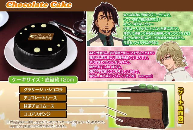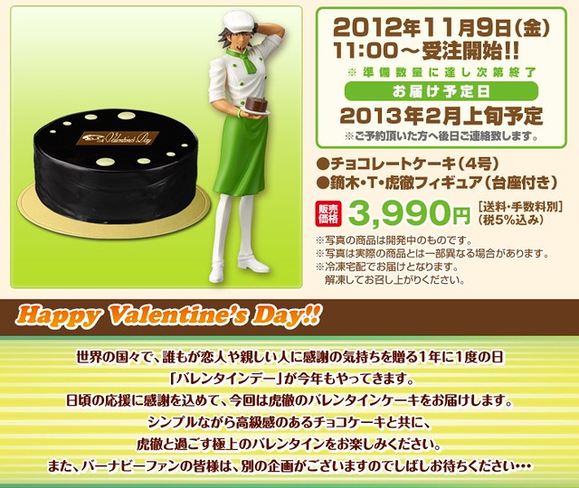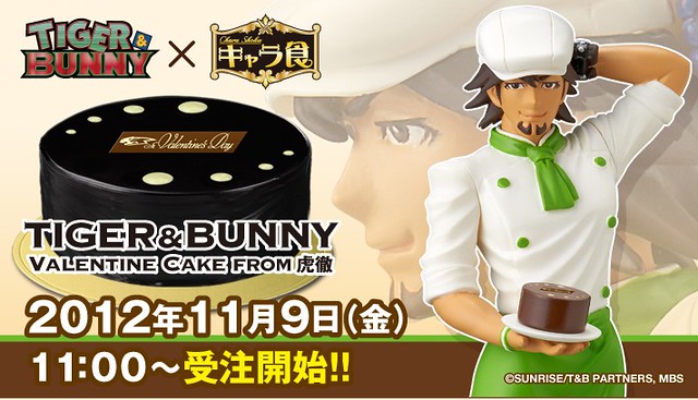 日本於11月9日開始開放預購「TIGER & BUNNY 特製情人節蛋糕虎徹版」,TIGER & BUNNY的虎徹推出蛋糕+特製造型公仔已經不是第一次,但這次多了情人節主題,所以是以巧克力口味製作。隨附的虎徹看起來有點害羞,好像這巧克力是要送給心儀的女性?看來鎖定目標是女性族群啊!本商品日幣參考售價約3990圓,現在預購預計2013年2月推出,提供大家參考!