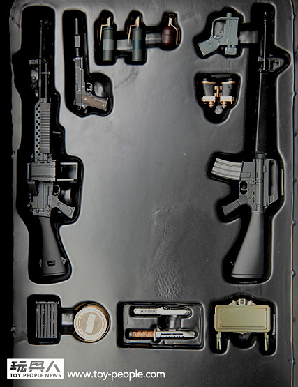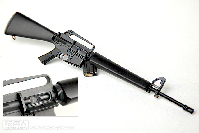 ▼ 配備武裝XM16E1 突擊步槍,槍身作了簡單的舊化,可取出彈匣,拋殼窗可打開看到裡頭的槍機。XM16E1 突擊步槍是美國陸軍所使用的試驗性原型,與M16本質上相同,但XM16E1 於槍機部分增加了槍機輔助閉鎖裝置。後來XM16E1 進階改良後正式命名為世人熟知的M16A1 突擊步槍。
