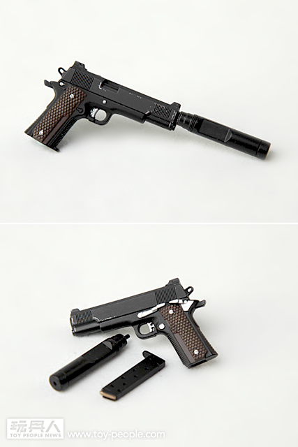 ▼ 以“潛行”、“不殺”為主要訴求的“Metal Gear”系列,自然配備滅音器的槍枝成為玩家最常使用的武器,許多“Metal Gear”系列的主視覺插畫,主角皆拿著配備滅音器的手槍。Snake 的招牌武器,M1911A1 手槍,可將扳機往後扣、滑套向後拉、取出彈匣以及將滅音器取下。