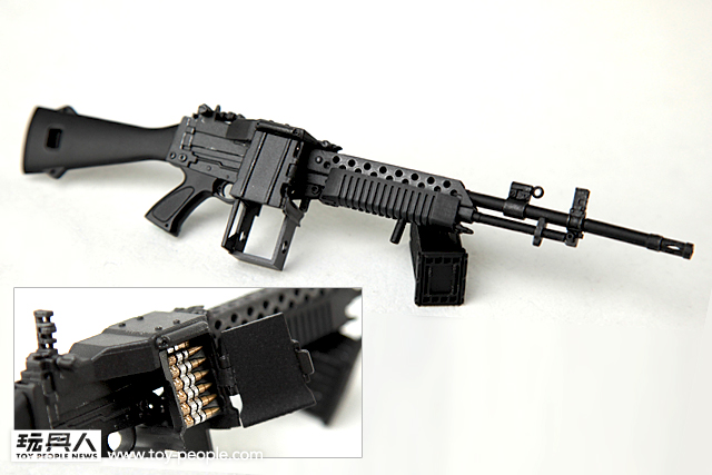 ▼ M63 機槍,準心可立起,側邊可掀開看到裡頭的子彈,並且可在下方裝置集彈箱。M63 機槍正式名稱為Stoner 63 武器系統。1963年由Eugene Stoner 所發明,為M16 系列步槍的前身。Stoner 63 武器系統為「模塊化槍械」的概念具體實現作品,可輕易的改裝以適應不同的需求。藉由翻轉槍機、替換槍管組或是使用彈匣與彈鍊,Stoner 63 武器系統就能改變成為卡賓槍(carbine, rifle)、班級指定神槍手步槍(Designated Marksman Rifle)、班用自動武器(squad automatic weapon)、班支援機槍(crew-served medium machine gun)或是固定式機槍(mounted medium machine gun)。