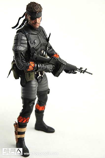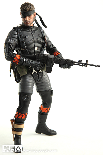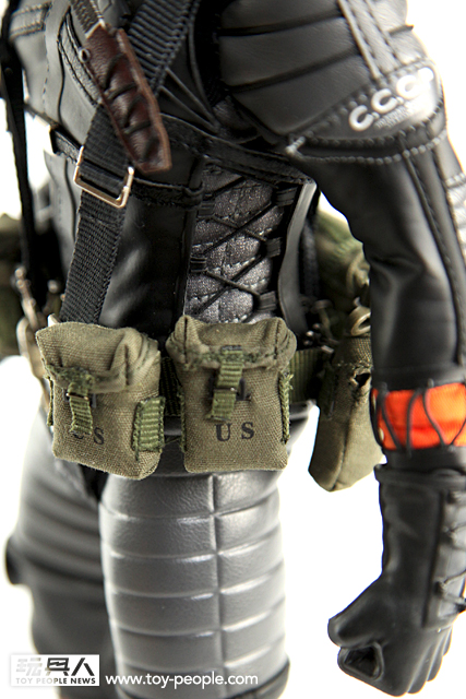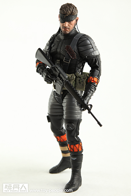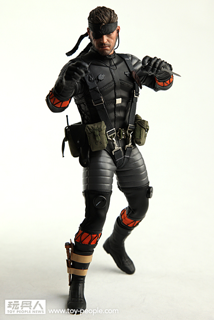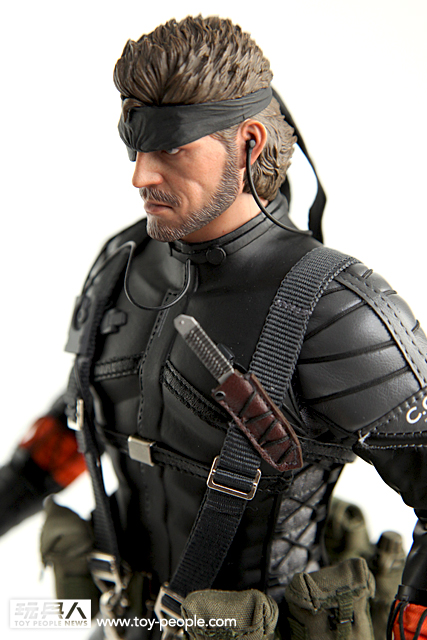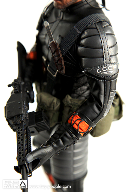 ▼ 身上的潛行服使用了Hot Toys 新的技術製作,包含了合成皮與多種複合材質製作,造型相當地具有深度,質感與裁縫相當精良。最早的潛行服是由蘇聯在1960年代所開發,「食蛇者作戰」期間,The Boss 穿著一件白色的潛行服原型,並且在她叛逃蘇聯之後,將其原型與太空裝改裝。第二款潛行服原型是黑色的,由Naked Snake 在Groznyj Grad 武器實驗室發現。潛行服使用一種特殊的防彈纖維製作,並且能夠抵擋高溫、絕緣與防潮,減少體力的損失與減輕傷害,在許多環境下能夠有效率地偽裝。後來Naked Snake 穿著這一套服裝與The Boss 對決。