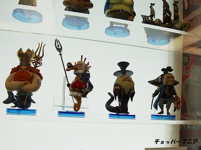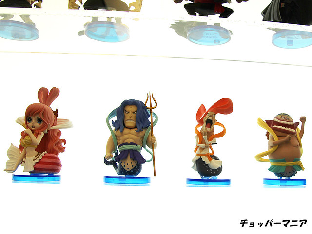 在第30回アミューズメント展覽中Banpresto玩具公司的World Collectable Figure系列(玩家簡稱WCF系列)攤位上,公開了預計推出的新商品,照片上方是水之七島篇章有動物型態CP9的成員、湯姆等等人物角色,照片中間是魚人島篇章的白星公主、魚人島龍宮王國的國王尼普頓、海王星三兄弟的老大鯊星、海王星三兄弟的老二皇星、海王星三兄弟的老三翻車星、右大臣海馬部長、左大臣(鯰魚大叔)等等,提供給喜歡海賊王WCF系列的玩具人參考。