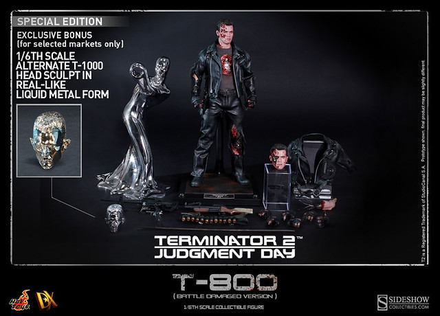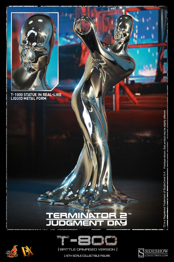 這一款T-800戰損版,豪華地附屬了兩款造型不同的戰損頭雕,由Hot Toys 最知名的頭雕大師Yulli 與近日推出許多傑作聲勢高漲的K.A. Kim 兩人製作。兩款造型不同的頭雕,一款配備了Hot Toys 專利的可動眼技術(Parallel Eyeball Rolling System (PERS)),另一款則是具備可動、以及能夠讓眼睛發光的LED 燈機制。除此之外,還搭配一款液態金屬人T-1000 的電鍍製作造型雕像,部分特殊的店家還將販售特殊版本附有T-1000 臉孔模樣的電鍍頭雕可供造型雕像替換!