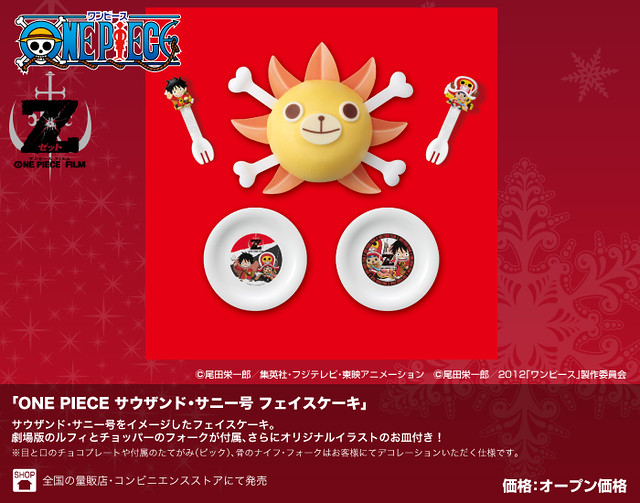 先前我們曾為大家介紹過「海賊王劇場版Z豪華千陽號巧克力蛋糕卷」,近日日本為搶聖誕商機,再公布了一款「海賊王劇場版特製千陽號蛋糕(サウサンド・サニー号 フェイスケーキ)」。與先前介紹版本相同,都附有劇場版特製餐具(叉子X2、盤子X2),差別是蛋糕是千陽號的船首造型。本商品直徑約12公分,日幣參考售價未定(開放價格、無公定價),預計12月下旬推出,提供大家參考!