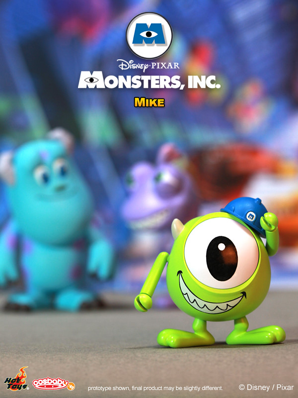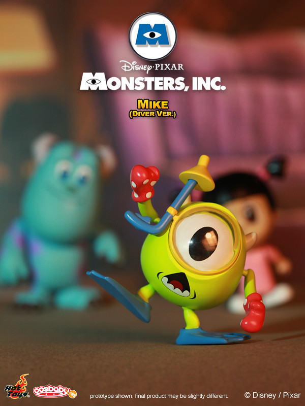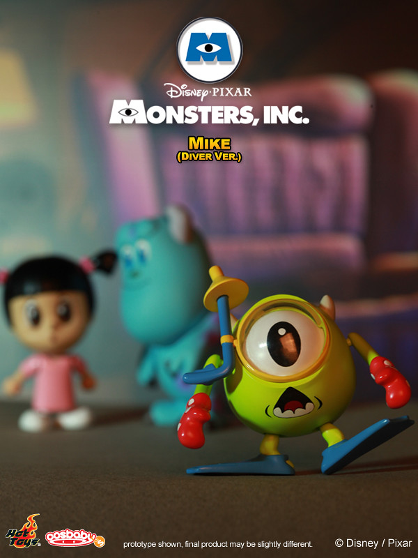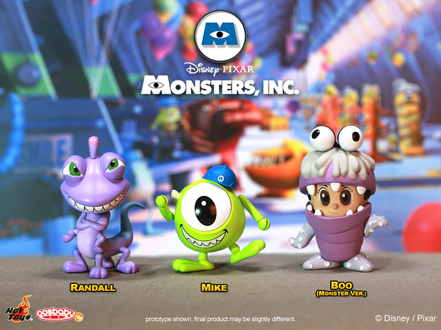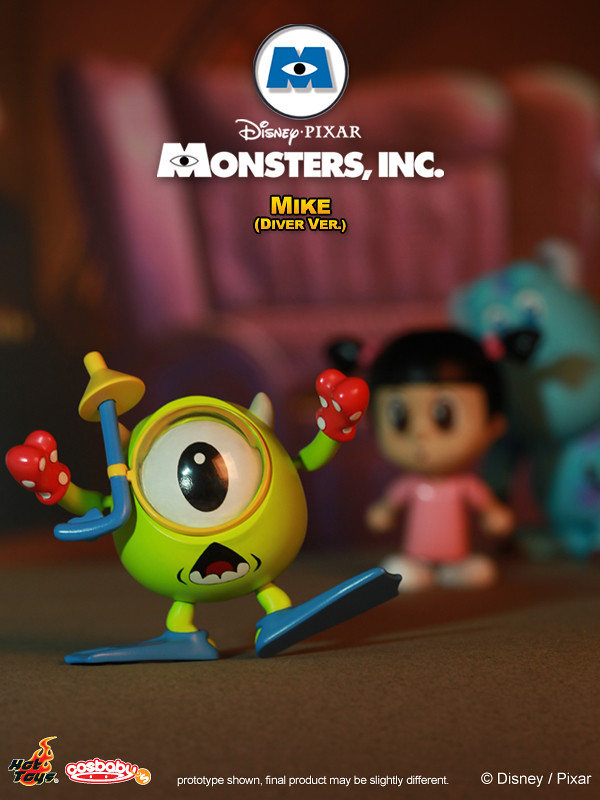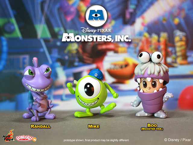 Hot Toys - COSB143-148 - Monsters, Inc.: Cosbaby 全套6款:阿布(Boo)、阿布怪獸版(Monster Ver.)、毛怪(Sulley )、大眼仔(Mike)、大眼仔潛水版(Diver Ver.)以及藍道(Randall),將有單售以及6款套裝的販售方式,預計2013年1月發售,台灣代理野獸國玩具公佈全套6款,參考售價2100 新台幣。