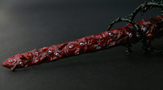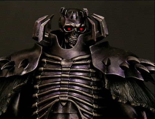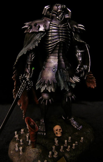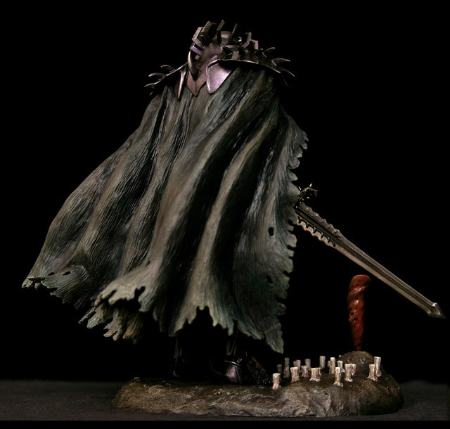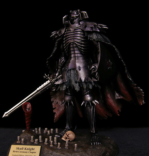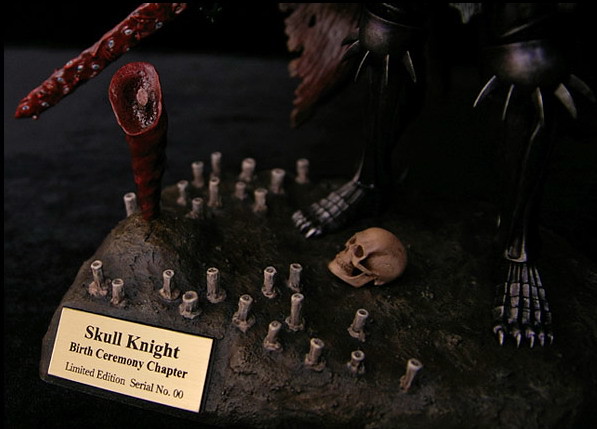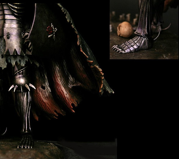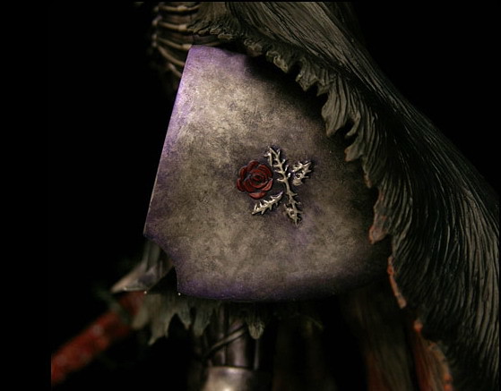 作品動作設定是骷髏騎士現身於祭壇,所以台座有看似祭壇的蠟燭遍佈,另外骷髏頭掉落地上,顯然是邪教的不祥之地,令人發毛啊!現身祭壇的骷髏騎士採用黑鐵色設計,格外有厚重的真實感。手持特有的荊棘玫瑰圖樣盾牌與長劍,刻劃十分細膩,小處都不放過呦!武器還可以替換成滿佈貝黑利德(霸王之卵)的喚水之劍,鮮紅色的詭異模樣,充分顯現烙印勇士的視覺風格。畫龍點睛之處就是斗蓬採用了綠色、繁複皺折的紋理設計,讓整體更添舊化的真實存在感。