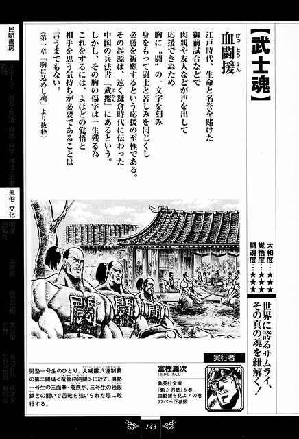 江戶時代以生命和名譽為賭注的重要比賽 親人或朋友無法出聲加油打氣所以在胸口刻一個鬥字表示和戰士身受相同的痛苦 祈願一定要獲勝應援的最高境界。聽說源於早在鎌信時代就已流傳的中國兵書「武鑑」可是胸口的字會一輩子留著 因此這麼做需要下很大的決心才肯為對方犧牲。
