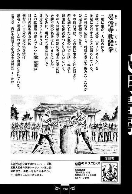 就一般來說 大家應該都知道 醋含有一種使人體柔軟的大量酸性物質。所謂「晏逅寺軟體拳」就是應用此性質而創造出來的特殊拳法。因此 修練者幾乎是在一個裝滿醋的大缸裡生活 成長著 以便養成這種超柔軟的體質。這種違反人體基本構造之束縛的拳法 一定擁有無堅不催的力量。附帶一提 日本常吃的一種叫辣韭的副食品 就是由軟體拳的高手「陳辣韭」於修練時 為進食方便 直接將蒜頭攜入醋缸內醃製而成的。