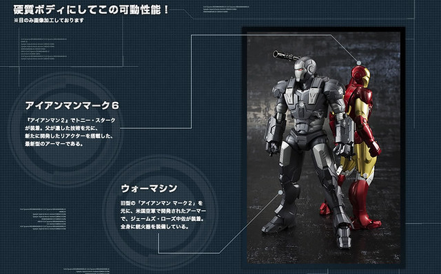 日Bandai玩具公司旗下受歡迎的S.H. Figuarts可動系列今日公佈將推出電影鋼鐵人系列的可動關節玩具,預計在首波2013年5月推出Warmachine 鋼鐵人 戰爭機器,付多個手掌和射擊槍火、飛行火焰等等配件,尺寸高約14.5公分,售價約5250元日幣,有興趣的玩具人可以比較一下之前2011年10月販售過海洋堂輪轉可動的戰爭機器什麼地方不同,提供給喜愛鋼鐵人系列的玩具人參考。