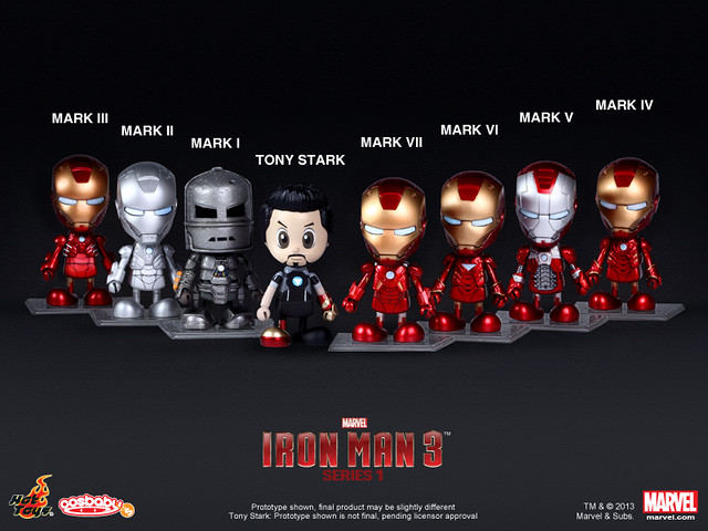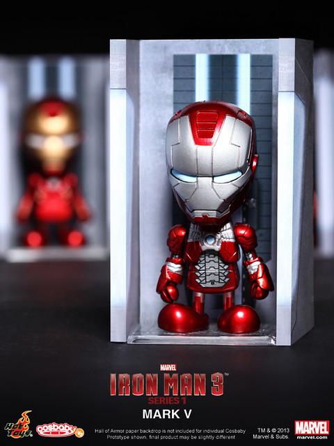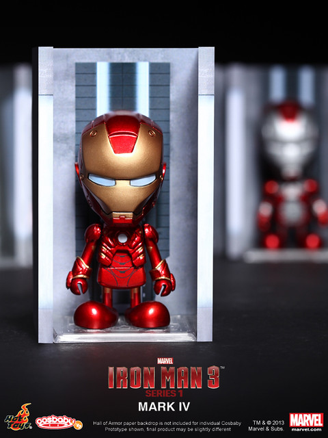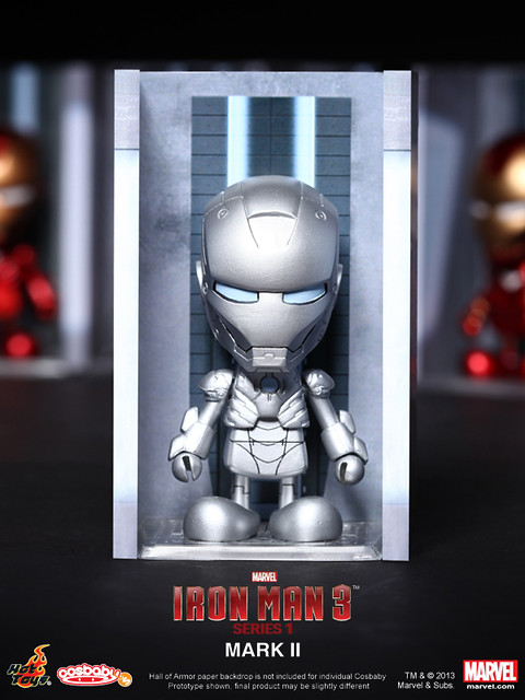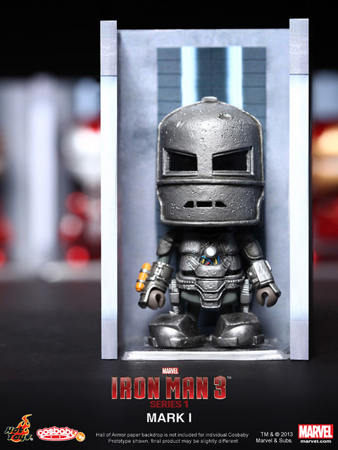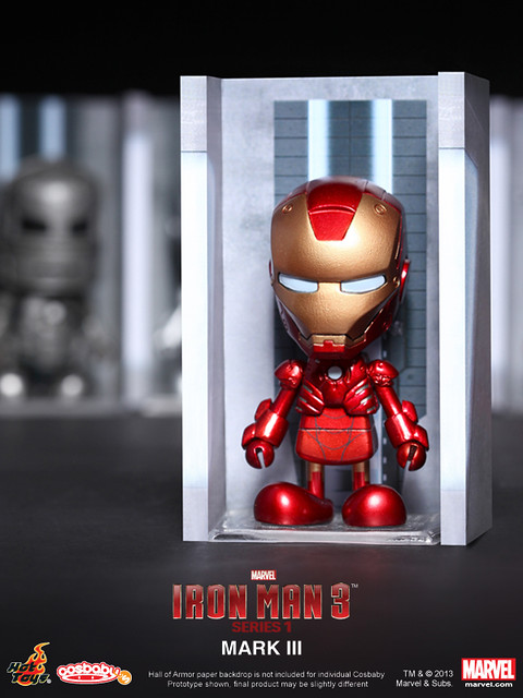 Hot Toys 除了12吋商品之外的熱門產品系列“COSBABY”將推出「鋼鐵人3 COSBABY」。這一套COSBABY 預計將推出8個款式,分別為:Mark I、Mark II、Mark III、Mark IV、Mark V、Mark VI、Mark VII 以及東尼‧史塔克。每一款角色皆搭配了一款特殊設計的「裝甲格納庫」紙盒包裝,另外還將推出一套8款的套裝組合,搭配了「裝甲格納庫」紙盒與紙地台的特殊式樣組合,讓玩家能夠完整的呈現東尼工作室的模樣!~