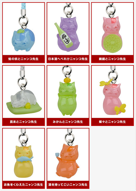 喜歡漫畫「夏目友人帳(妖怪聯絡簿)」的朋友一定很喜歡作品中的貓咪老師,有著逗趣造型,加上危機時展現的強大妖力,是粉絲們隨身保鏢的第一指定人選!既逗趣又給人安全感,讓貓咪老師的周邊不斷推陳出新。現在為您介紹的是由TAKARA TOMY製作,預定本月份推出的吊飾新作!採用類似坊間幸運石的晶透質感製作,搭配各種亮麗色彩與可愛造型,是您隨身祈福、帶來好運或裝飾的不錯選擇!本商品預計推出8款,以轉蛋形式販售,單一日幣參考售價約200圓,提供各位粉絲參考!