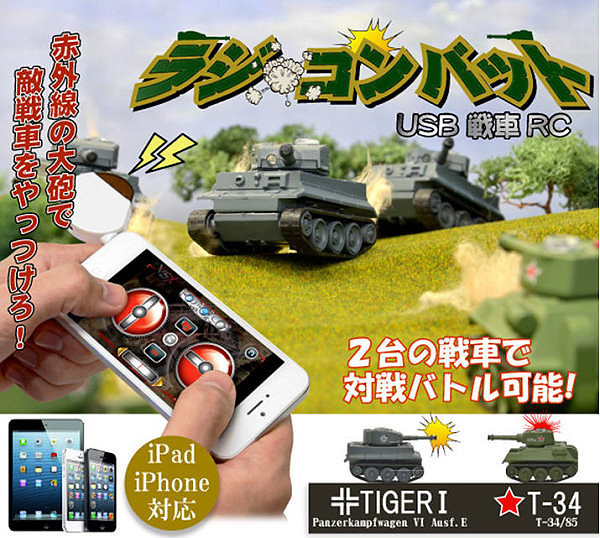 由日本TTC(Trust Technology Corporation)公司在「JTT On line Shop」線上購物網站限定販售的「RC Combat USB 戰車RC for iPad/iPhone」iPad/iPhone 智慧手機遙控坦克,可以使用iPad/iPhone的觸控螢幕來遙控坦克,只要在手機或是iPad加裝上無線遙控器的裝置後就可以控制坦克的前進、後退、爬坡、左右迴轉等等,還可以與朋友展開互相攻擊的砲彈發射遊戲。