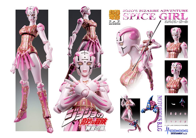超像可動JOJO冒險野郎第五部系列再開!繼去年11月所發表的「潘納科達‧福葛」之後,再度推出由老闆的女兒「特莉休·烏納」所持有、女性人型,可以使攻擊的目標即使是岩石、金屬也能夠變成橡膠般地柔軟的替身“辣妹”スパイス・ガール。