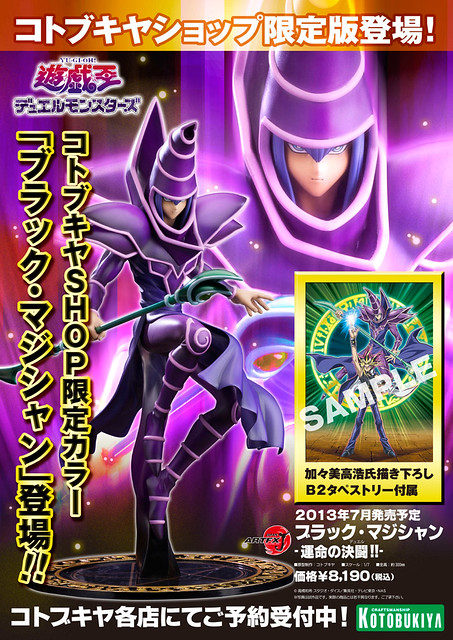 繼先前玩具人介紹過壽屋推出的遊戲王黑魔導立體作品後,壽屋再推出黑魔導異色限定版。有別於先前藍色版本,紫色版本更透露出神秘的魔法魅力。本版本只限定在指定通路「コトブキヤSHOP」販售,並附贈壁掛捲軸一幅。高約30公分,日幣參考售價約8190圓,預計7月推出,提供大家參考!
