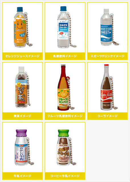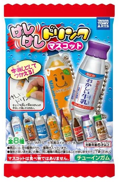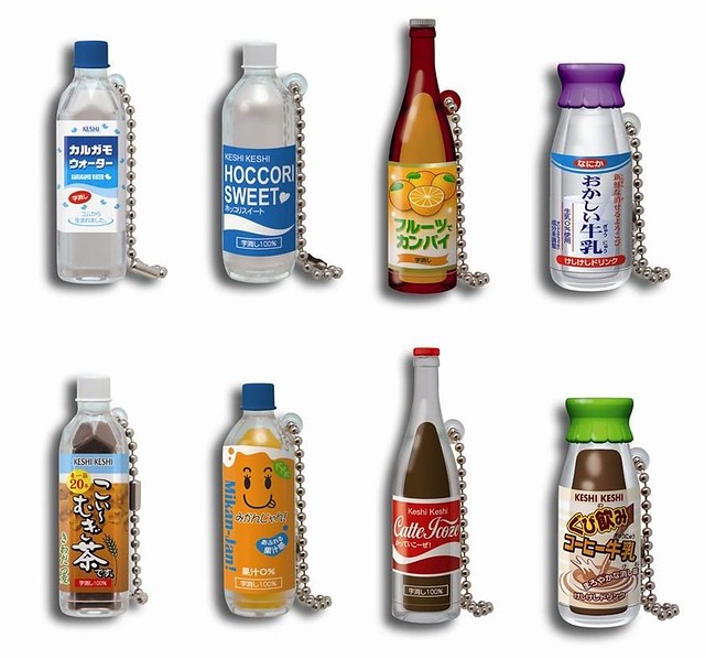 這標題到底是要介紹飲料、還是橡皮擦還是吊飾?其實它就是迷你飲料瓶模型吊飾,但內含一塊橡皮擦。如果您跟小編一樣愛喝飲料、工作、休閒總愛來一杯,那這款作品一定討您歡心。特別是將各種人氣飲料瓶裝造型收錄,不過也許是因為版權有小小改變,但還是蠻有樂趣的!本作品一共8款,本月份在日本推出,單一日必定價189圓,提供給大家參考!