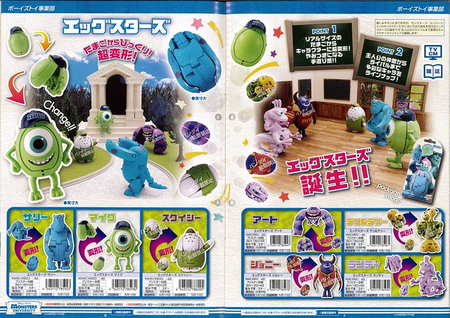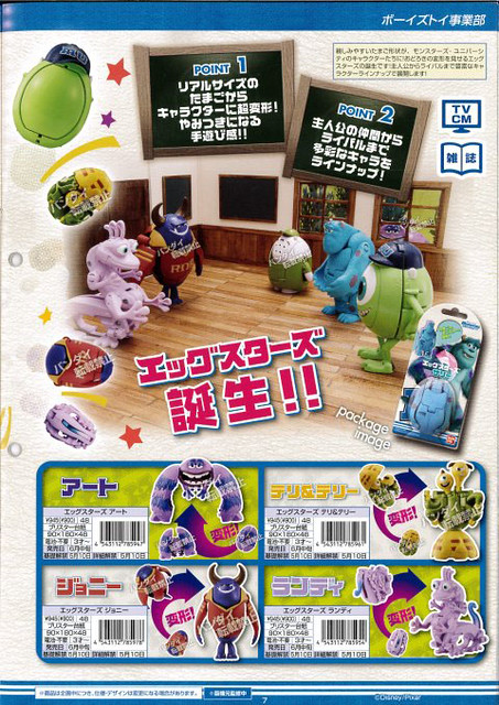 日廠BANDAI萬代玩具公司的ボーイズトイ事業部預計在5月~6月陸續推出電影怪獸電力公司第二集的怪獸大學變形蛋,將電影中的主要角色毛怪、大眼怪等等以雞蛋的形狀打開可以變成角色人物的可愛模樣,雞蛋高約只有6公分變成怪獸大學裡面角色人物的尺寸大小不一樣高,單款售價約945元日幣,喜歡怪獸大學的玩具人可以參考一下。