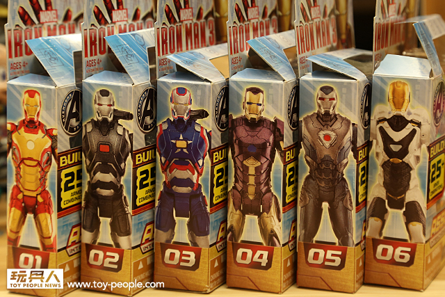 ▼ 包裝側面印著角色的插圖。前面1~3號是大家都很熟悉的主角,後面三款是電影「鋼鐵人3」中將會登場的神秘款式!