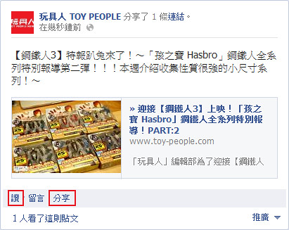 延續了這次的活動,本週台灣孩之寶(HASBRO)將繼續贈送「玩具人」忠實讀者「鋼鐵人」系列相關商品!即日起只要你到『玩具人』Facebook粉絲團按“讚”,分享「迎接【鋼鐵人3】上映!「孩之寶 Hasbro」全系列相關商品特別報導!PART:2」的文章,並在分享當中寫下你最喜歡文章中的哪一款商品,獲選的玩具人就能獲得你指定的該商品喔!(寫下你最喜歡哪一個款式以及簡短心得。只寫“已分享”是不會中獎的喔!)另外,還將抽出三個名額獲贈美國原版進口「鋼鐵人3」電影海報!請各位玩具人千萬把握機會!~