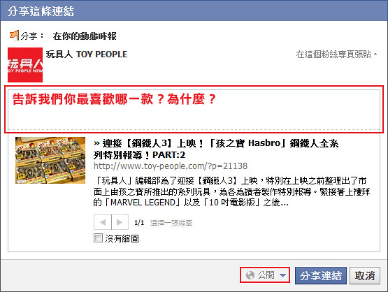 1.到本次的「迎接【鋼鐵人3】上映!「孩之寶 Hasbro」全系列相關商品特別報導!PART:2」商品開箱報告文章按“讚”,並分享至你的塗鴉牆上,寫下你最喜歡哪一個款式以及簡短心得。只寫“已分享”是不會中獎的喔!