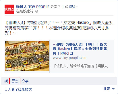 2.「玩具人 TOY PEOPLE NEWS Facebook 粉絲團」上側。