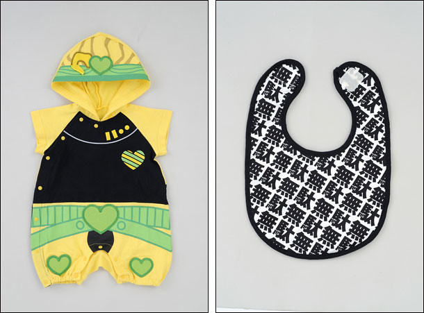 繼2010年所推出的假面騎士、超人力霸王、七龍珠、小叮噹... 各種動漫主題為發展的嬰兒服之後,BANDAI 再次推出以「JOJO冒險野郎」為主題的嬰兒服與圍巾套裝組合,一共推出了兩款:空条承太郎「オラオラスタイ」與DIO「無駄無駄スタイ」。每一個款式的嬰兒服皆以該角色的服裝造型作為設計,並佐以經典台詞的圍巾「オラオラ」(歐拉歐拉)與「無駄無駄」(沒用沒用)...