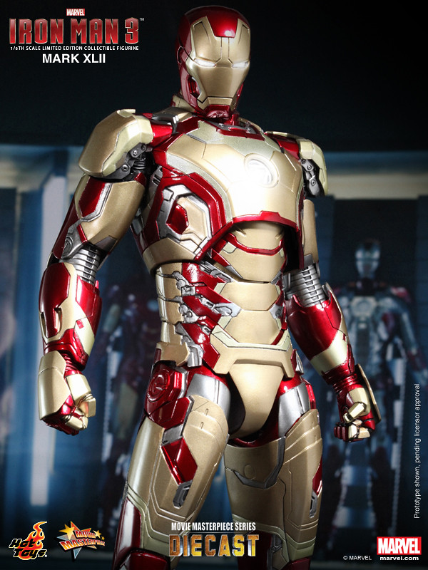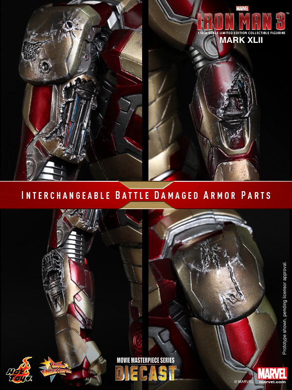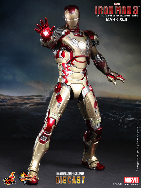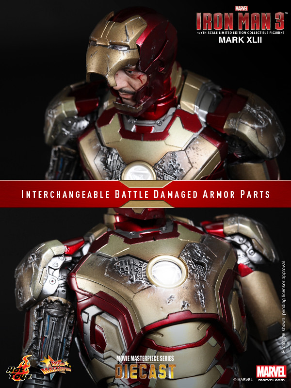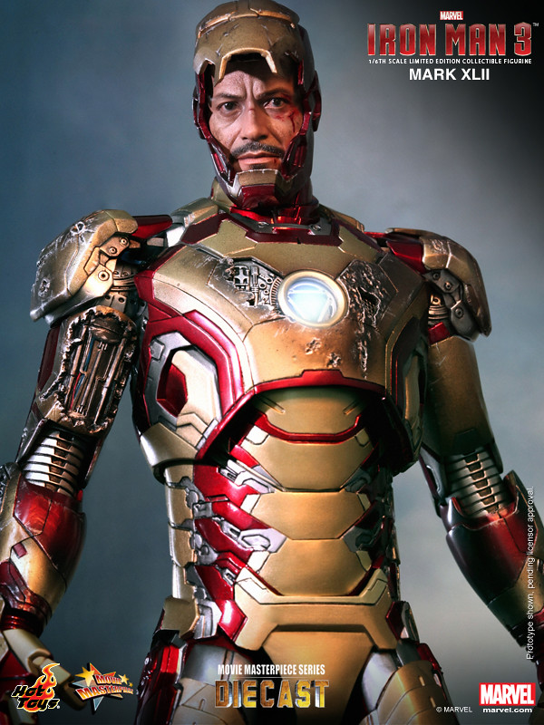 Hot Toys 合金1/6 人偶第二彈發表!繼「鋼鐵愛國者」之後,Hot Toys 再度發表了「鋼鐵人3」主角「馬克42」(Mark XLII)。同樣是使用合金技術製成的馬克42,搭配了大量的戰損配件,可切換完整 / 戰損兩個狀態,並且具備了大量的造型細節與考究,加上了可掀面罩與可發光鋼鐵人兩種模式,以及高度可動的靈活活動範圍,這絕對是鋼鐵人戲迷的必備款式啊!!!~