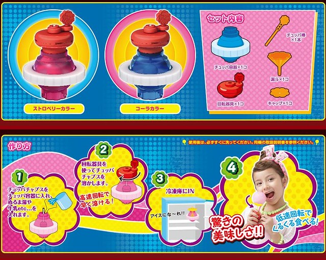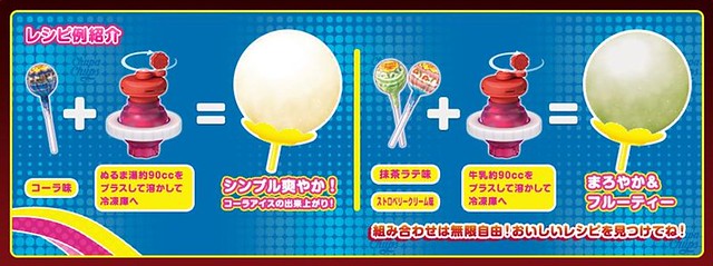 是的親愛的!我把那根變大了!變大才更好吃更好舔啊!TAKARA TOMY 本月將發售與西班牙知名棒棒糖「Chupa Chups」(台灣譯名:加倍佳)合作的神奇食玩道具(おかしなアイスキャンディー チュッパチャプス)。這是一款為加倍佳棒棒糖量身打造的創意商品,您只要選好想要吃的棒棒糖口味,配合飲料放進去高速旋轉後冰存,再拿出來就變成加倍佳大冰棒啦!聰明的你還可以混和多種口味棒棒糖、並搭配牛奶、果汁等等混和,設計出您獨一無二的玩酷口味!這麼棒的設計共推出2種顏色,每款日幣參考售價約1575日圓(稅入),好吃又好玩快來一根吧!