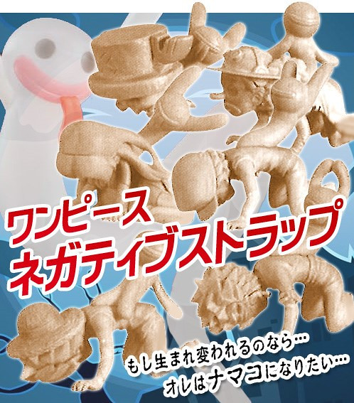 「消極的海賊王」吊飾將「海賊王」角色以被悲觀鬼魂穿透過後,消極的跪地Orz 姿態表現出來,每一個角色的憂鬱消極模樣看起來相當歡樂!~ 一共推出6 個款式:魯夫、索隆、海兵、漢考克、喬巴以及完全沒被影響的騙人布。