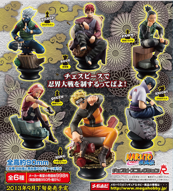 日本Megahouse 玩具公司推出的西洋棋系列普遍收到玩具市場的粉絲們歡迎,預計在2013年9月推出チェスピースコレクションR NARUTO-ナルト-疾風伝,以人氣動畫Naruto 火影忍者 疾風傳的主題呈現,收錄了主要角色人物有鳴人、我愛羅、卡卡西、佐助、小櫻和奈良鹿丸等等六款,尺寸高約9公分,一樣預計推出兩款一黑一白顏色的底台,單款售價約998元日幣,喜歡Naruto 火影忍者的玩具人可以參考一下。