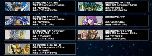 日Bandai玩具公司發行的聖鬪士聖衣神話系列已快要10個年頭了,這次預計將以10周年紀念為主題,再次推出一系列的10周年紀念商品,預計2013年9月推出天馬座 星矢(10周年神聖衣紀念版本),10月推出龍座 紫龍(10周年神聖衣紀念版本),11月推出天鵝座 冰河(10周年神聖衣紀念版本),12月推出女神 沙織(10周年紀念版本)等等,各款約7875元日幣,沙織比較貴一些要約10500元日幣,相信又是一個深不見底的大坑,有跳進聖鬪士聖衣神話系列大坑的玩具人,別忘記要繼續往下跳歐!