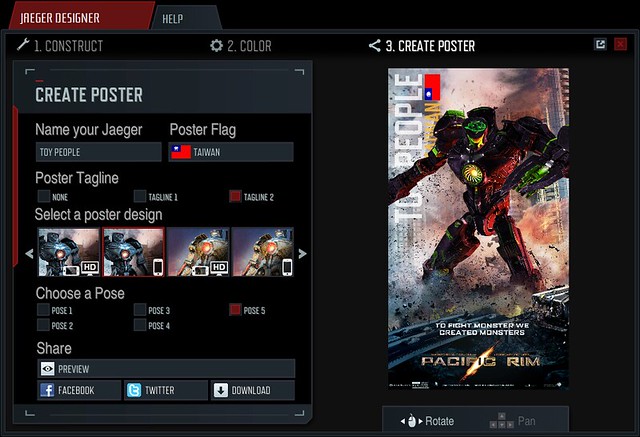 ▼ 第三階段,在這裡你可以將自己設計完畢的機器人發佈為電影海報。可以自己上字、選國旗(有台灣!)、海報標語、機器人的姿勢,並且發佈成電腦或手機...不同格式的海報!