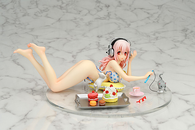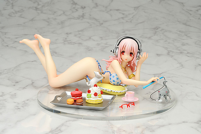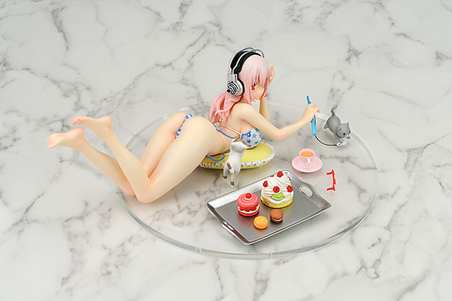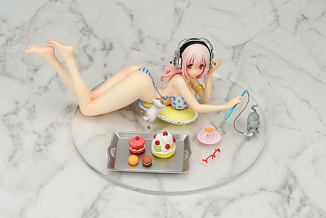 如果你是SUPER SONIC(すーぱーそに子)的粉絲,家裡面的收藏空間不允許放置大尺寸的SUPER SONIC,現在玩具人網站推薦給喜愛SUPER SONIC的玩具人一款比較不占空間,製作又相當精緻的SUPER SONIC Sweets & Bikini ver. 甜美與比基尼版本,尺寸大小高約 7.5公分、全長約 20公分,完整呈現すーぱーそに子在家裡面休息的時候,貓咪調皮的將她身上的比基尼拉掉的模樣,預計2013年10月推出,售價約11,340元日幣,喜歡SUPER SONIC 的玩具人千萬別錯過了。