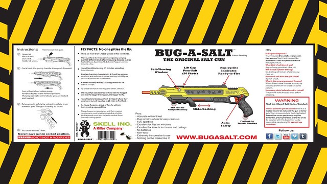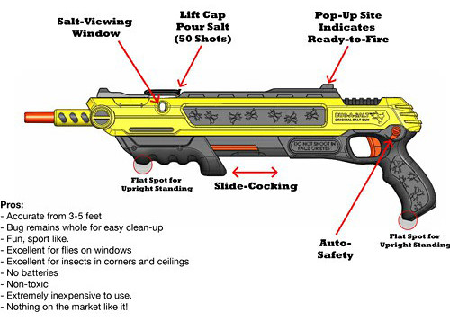 一位超討厭蒼蠅的男子Lorenzo Maggiore 發明了一款以食用鹽巴做為子彈的鹽巴散彈槍,名為『Bug A Salt』。這一把以食用鹽巴作為子彈的散彈槍,每裝填一次約一瓶蓋的量就能射擊約50次,有效距離約3英呎(93公分),每次射擊僅耗費一小撮的鹽巴,卻能相當有效率的打死蒼蠅。